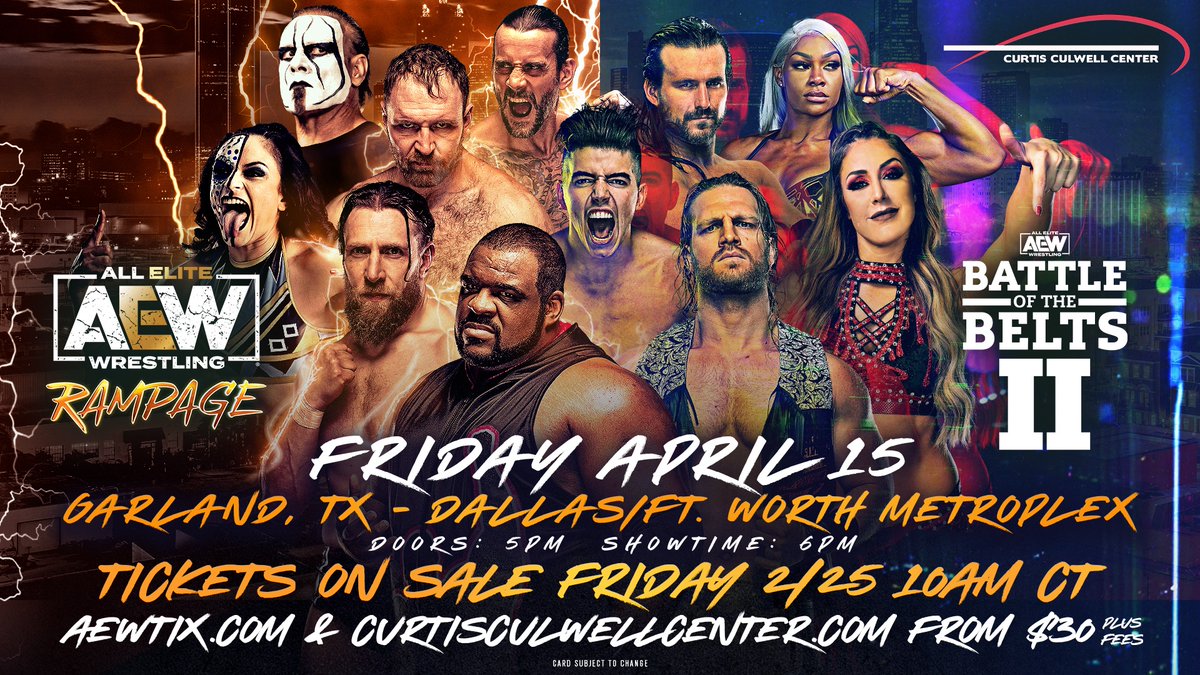 🚨 DALLAS / FT WORTH METROPLEX🚨#AEW is Returning to the @CulwellCenter Friday April 15 for a LIVE #AEWRampage & #AEW #BattleOfTheBelts Taping! Tickets start at $30 (+fees) and go on-sale Friday February 25 at 10am CT