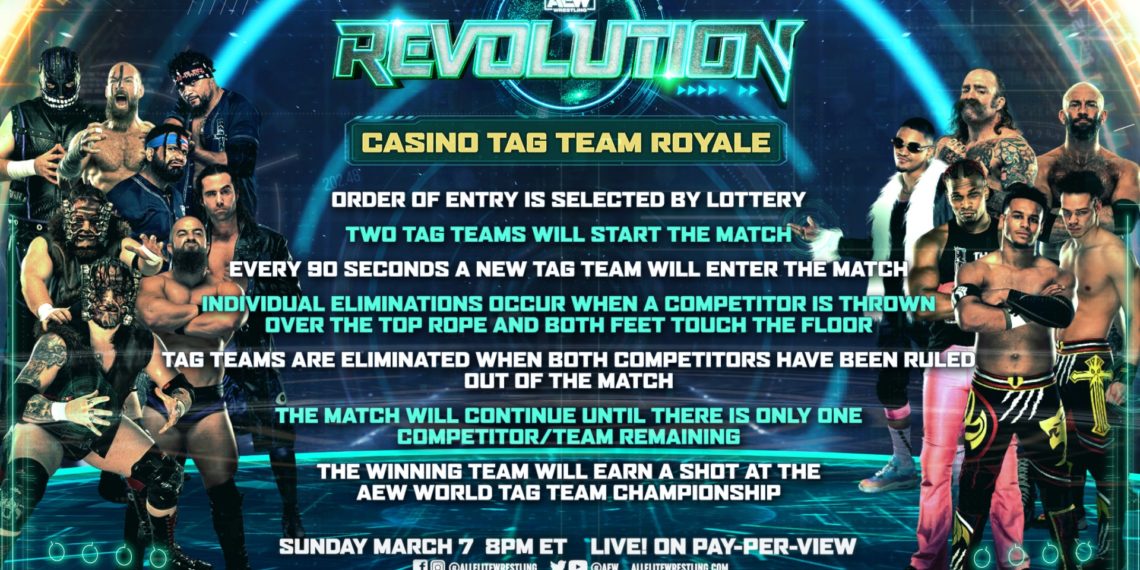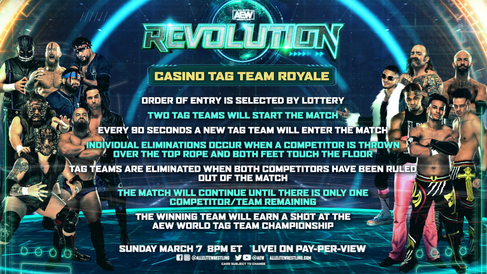 Here are the rules for the #CasinoTagTeamRoyale. 1 team will earn a future shot at the #AEW World Tag Team Championship, but to do so, they’ll have to outlast some of the top teams in #AEW at Revolution. Watch #AEWRevolution Sunday, March 7 Live on PPV 8pm on all major providers pic.twitter.com/JSTBgCRmHo