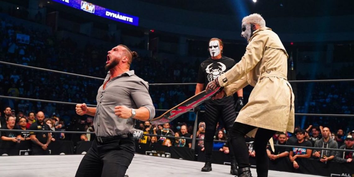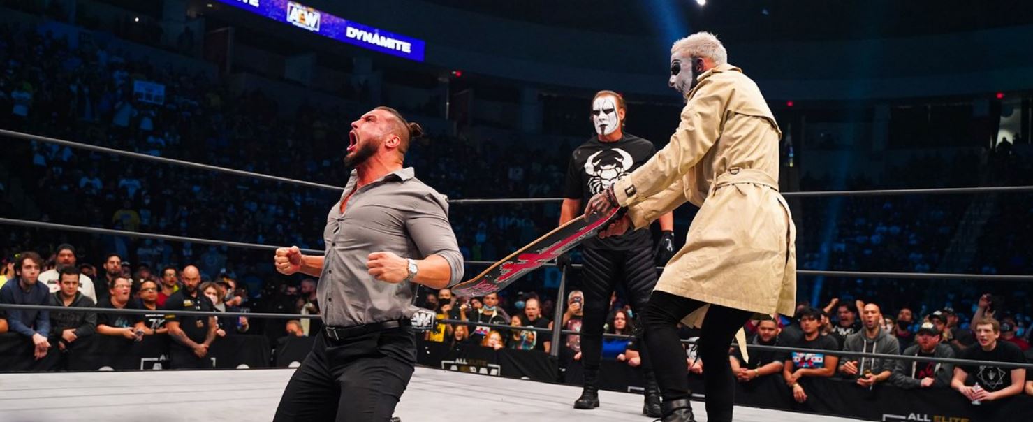 Last night’s AEW Dynamite episode saw Darby Allin, dressed as The Invisible Man, interrupt MJF’s in-ring segment where he took shots at Allin. During the promo, a scene appeared on the big screen with Allin destroying a man wearing a MJF mask. Sting then appeared and took out Shawn Spears and Wardlow with his bat.