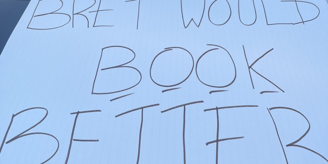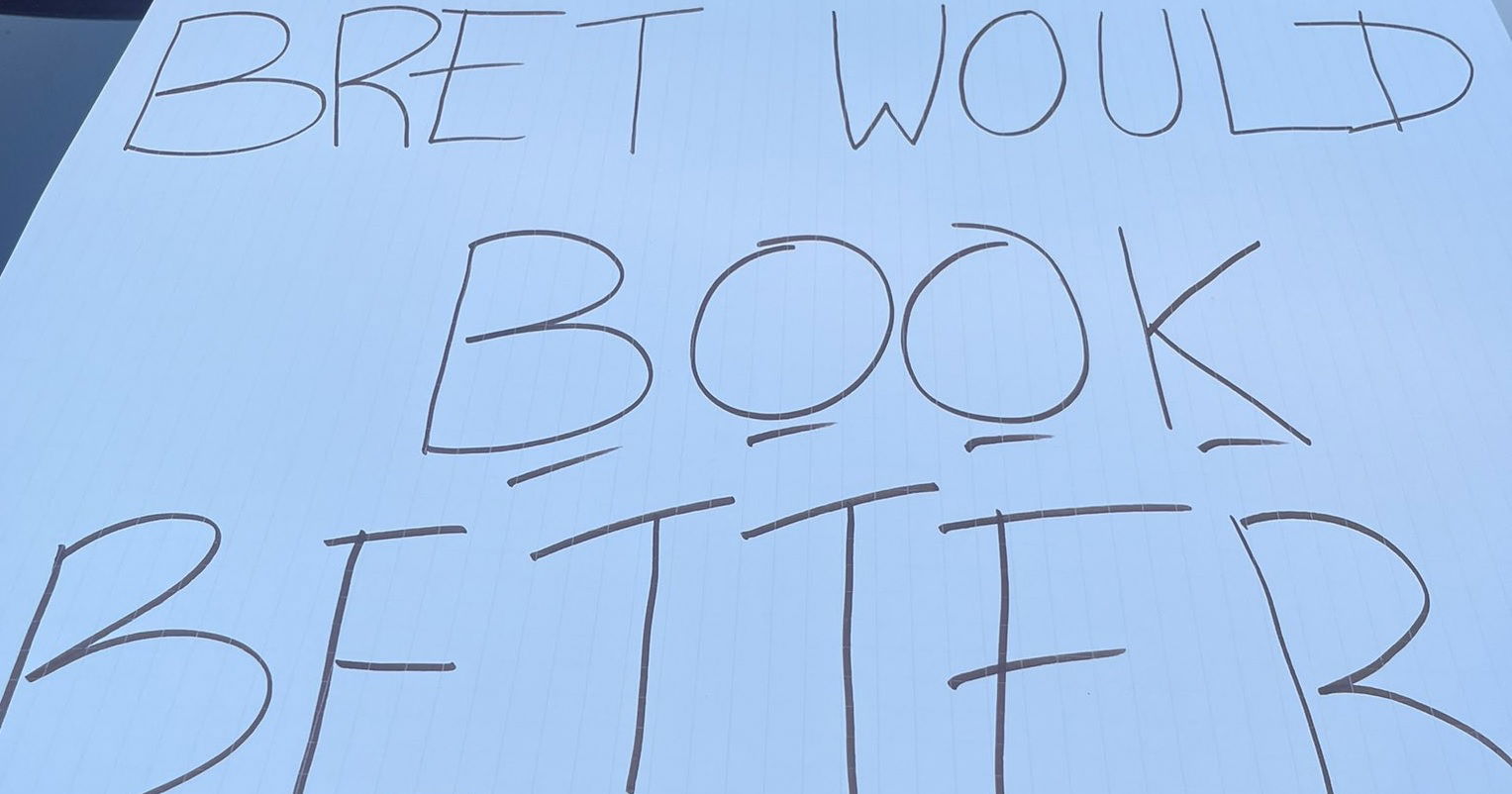 Jensen filled a ringside seat during the show that had previously been occupied, while branding a sign that read, “Bret would book this better.”