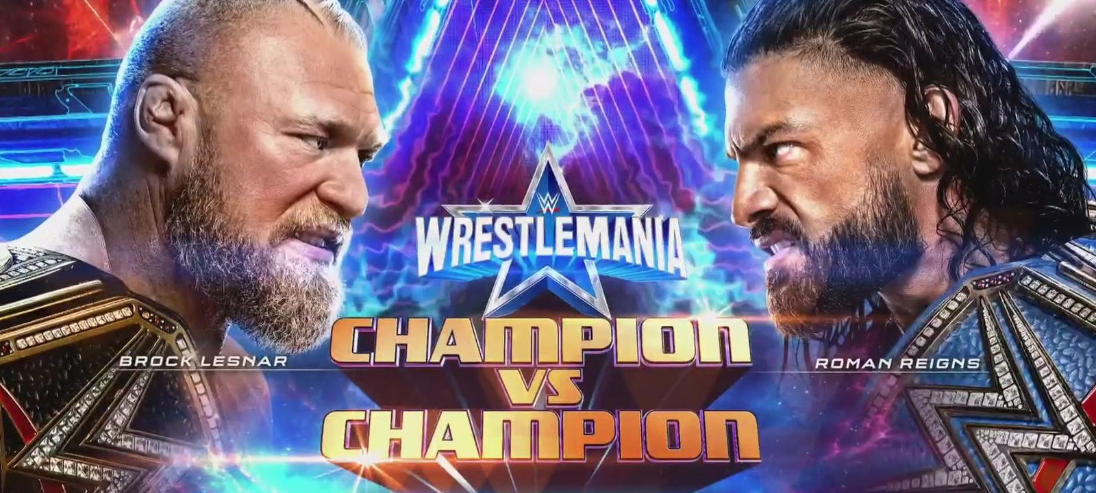 We noted before how WWE had been billing WWE Champion Brock Lesnar vs. WWE Universal Champion Roman Reigns as a Champion vs. Champion and a Title vs. Title match at WrestleMania 38 after Saturday’s Elimination Chamber win by Lesnar, but no details were provided.