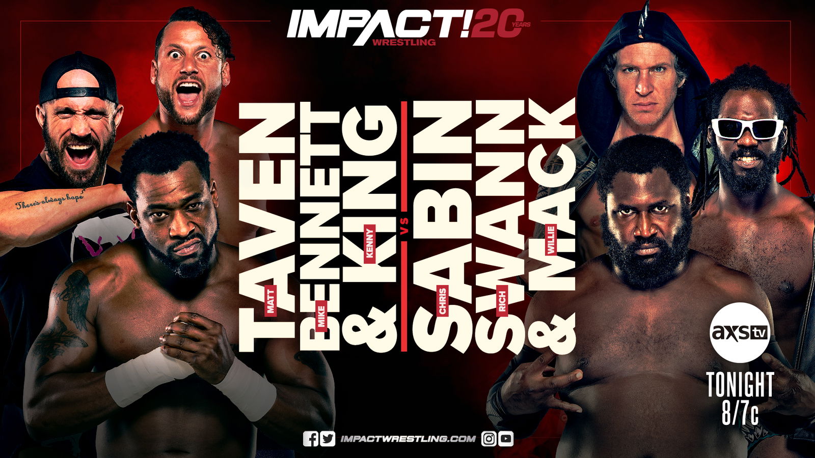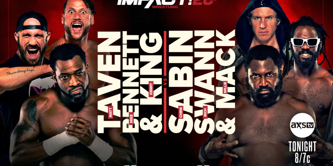 Honor No More attacks Team IMPACT before the bell rings. Double Irish Whip. Taven with The Stinger Splash. Bennett with a corner clothesline. Swann side steps King into the turnbuckles. Sabin kicks Taven in the gut. Sabin dumps Taven out of the ring. Swann with an elbow into the midsection of Bennett. Mack tosses Bennett out of the ring. Two Leaping Back Elbow Smashes. Mack with The Stinger Splash. Double Irish Whip Double Drop Toe Hold. The referee has no control whatsoever in this match. Sabin with a basement dropkick for a one count. King rocks Sabin with a forearm smash. King tags in Bennett. Sabin with a back elbow smash. Sabin unloads three knife edge chops. Bennett drops Sabin with The Big Boot. Bennett tags in Taven.
