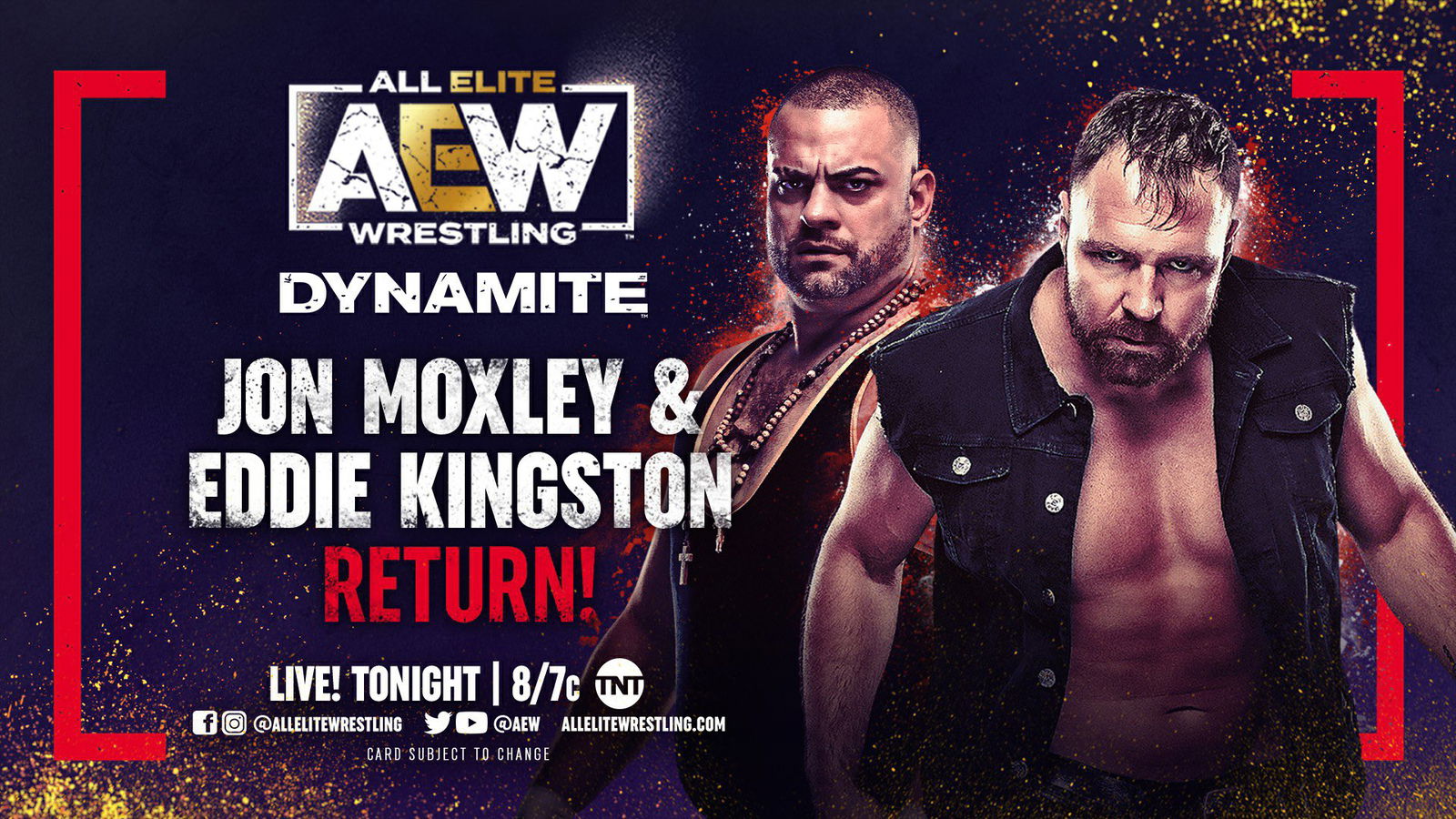 .@JonMoxley & @MadKing1981 #EddieKingston haven’t been seen on #AEWDynamite since they were attacked 2 weeks ago by @AEW World Champion @KennyOmegamanX, World Tag Team Champions @youngbucks, @The_BigLG & @MachineGunKA. Mox + Eddie return TONIGHT to Dynamite at 8pm/7c on @tntdrama pic.twitter.com/eC0r4i4shB