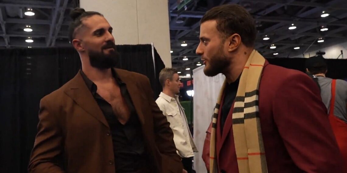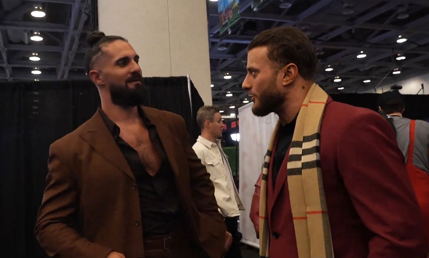 MJF and Seth Rollins meet at the Super Bowl Radio Row.
