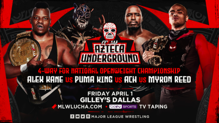 Major League Wrestling issued the following press release announcing a fatal-four way matchup for the National Openweight championship for the promotion’s April 1st AZTECA UNDERGROUND event from the Gilley’s in Dallas, Texas. Competing in the bout will be Puma King, Myron Reed, ACH, and the current champion, Alex Kane. Full details, including an updated look at the show card, can be found below.