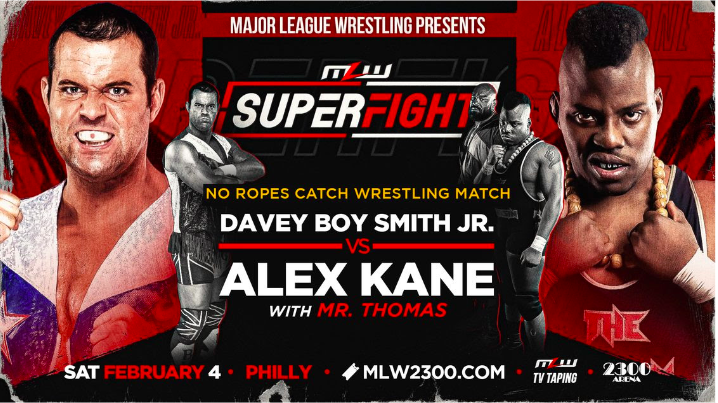 (PHILADELPHIA) — Major League Wrestling today announced a NO ROPES Catch Wrestling Match: Davey Boy Smith Jr. vs. Alex Kane (with Mr. Thomas) at MLW SuperFight’23 on Saturday, February 4 at the 2300 Arena in Philadelphia.