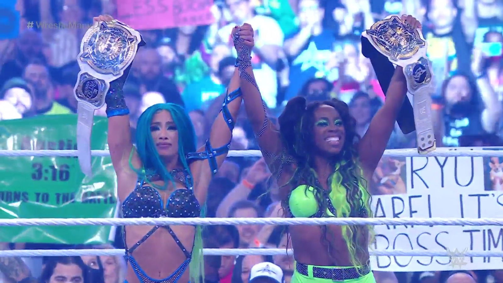 NEW CHAMPS!#WrestleMania @SashaBanksWWE @NaomiWWE pic.twitter.com/tML8Mlp5NH