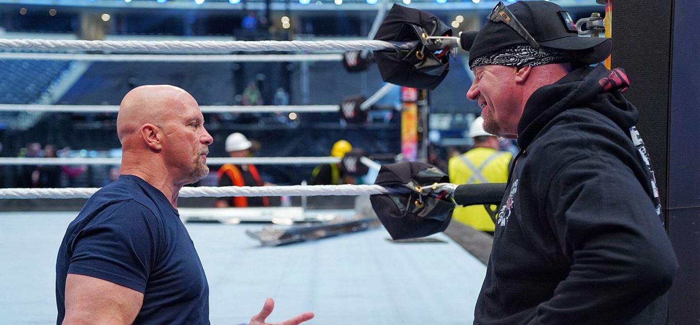 The WrestleMania 38 Kickoff pre-show panel spoke about how WWE Hall of Famer Steve Austin is in tremendous shape for tonight’s appearance on The KO Show with Kevin Owens. WWE tweeted this photo of Austin with 2022 WWE Hall of Famer The Undertaker during rehearsals earlier this afternoon and it is clear that Stone Cold is in great shape.