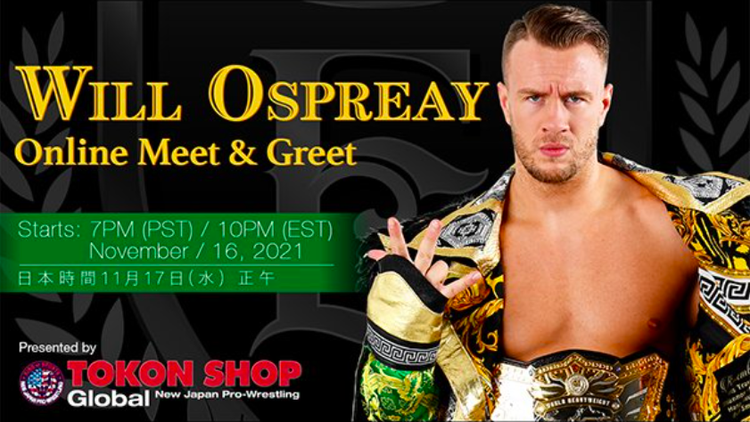 New Japan Pro Wrestling issued the following press release announcing that former IWGP World Heavyweight champion Will Ospreay will take part in an online meet-and-greet with fans on November 16th. Full details, including what exclusive merchandise will be autographed, can be found below.