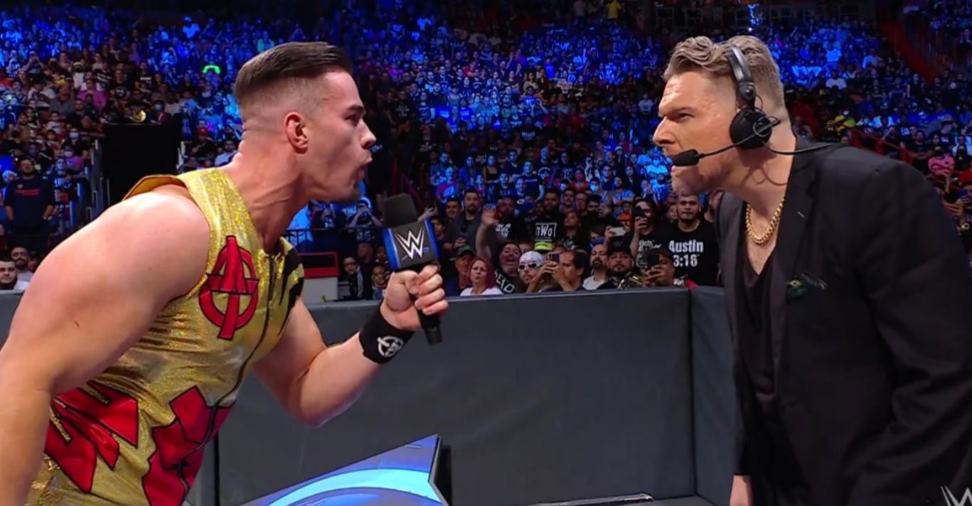 Tonight’s WWE SmackDown on FOX saw Theory come to the ringside area while taunting McAfee on the mic. Theory bragged about being the protege of WWE Chairman & CEO Vince McMahon, who is backstage for the show. Theory then said Vince only appeared on The Pat McAfee Show this week to set McAfee up. Theory said Vince doesn’t like McAfee, and thinks he’s just another loud mouth like everyone else does. Theory then went to ringside as McAfee got up to face off with him.