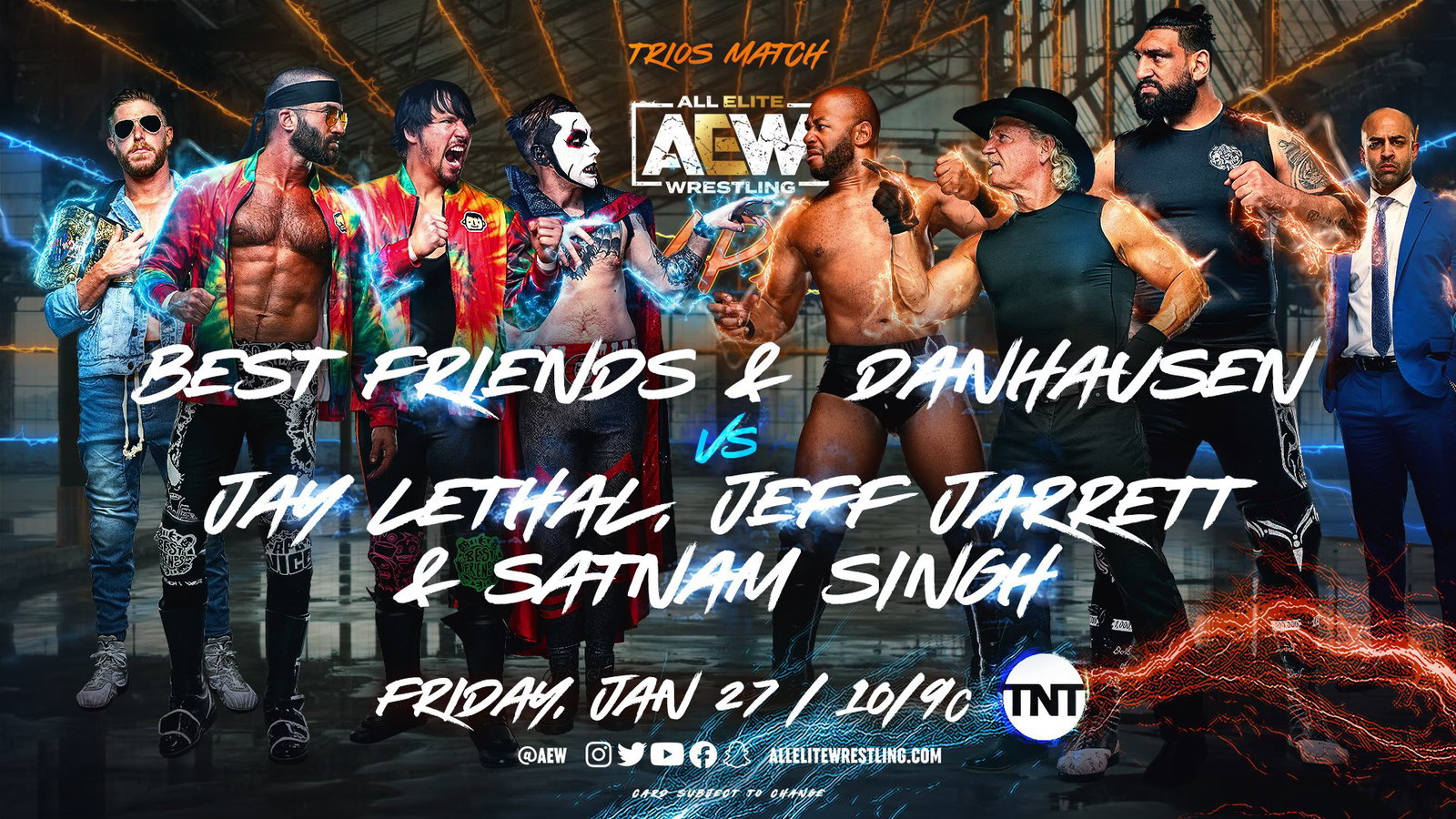 Jay Lethal/Jeff Jarrett/Satnam SinghAfter a series of altercations on @AEWonTV in recent weeks, the trio of Best Friends/Danhausen will fight Lethal, Jarrett & Satnam on TNT
