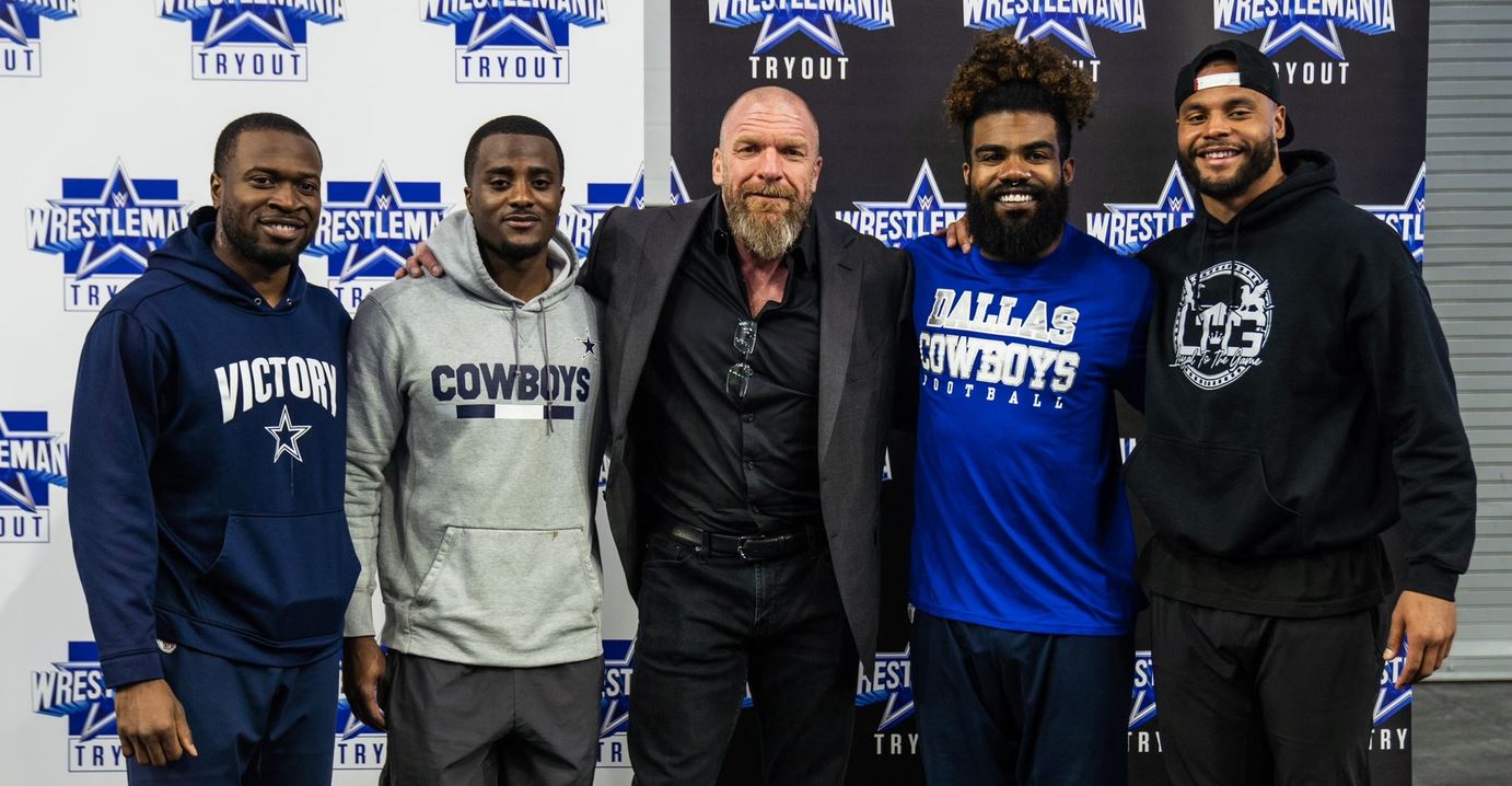 Triple H was joined by Dallas Cowboys players Anthony Brown, Jourdan Lewis, Ezekiel Elliott, and Dak Prescott at the tryouts. He cut a promo for fans on the Cowboys social media pages, inviting them to The Grandest Stage of Them All this weekend.