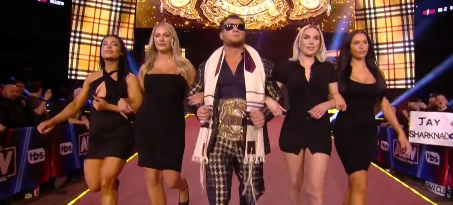 MJF was escorted to the ring by four women, then receiving a kiss on the cheek from the first three. The fourth woman he actually kissed was Canadian model and indie wrestler Seleziya Sparx, according to @AEWEnhance.