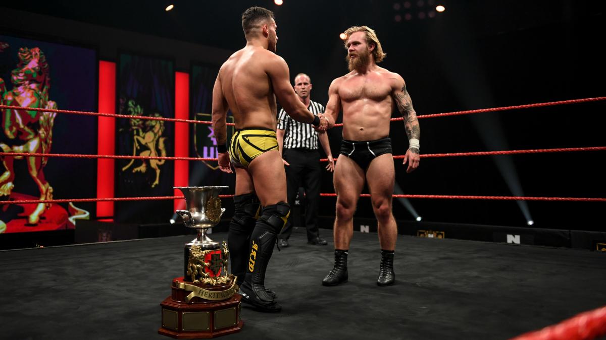 Test Of Strength. Bate works on the left wrist of Kid. Bate applies a side headlock. Kid sends Bate to the corner. Following a snap mare takeover, Kid drops Bate with a shoulder tackle. Bate drops down on the canvas. Kid cartwheels over Bate. Kid drops down on the canvas. Kid goes for a Hip Toss, but Bate counters with The Air Plane Spin. Kid with a Release German Suplex. Kid goes for an O’Connor Roll, but Bate holds onto the ropes. Kid pops back on his feet. Kid goes for a Northern Lights Suplex, but Bate lands back on his feet. Bate rolls Kid over to score the first pinfall of the match.